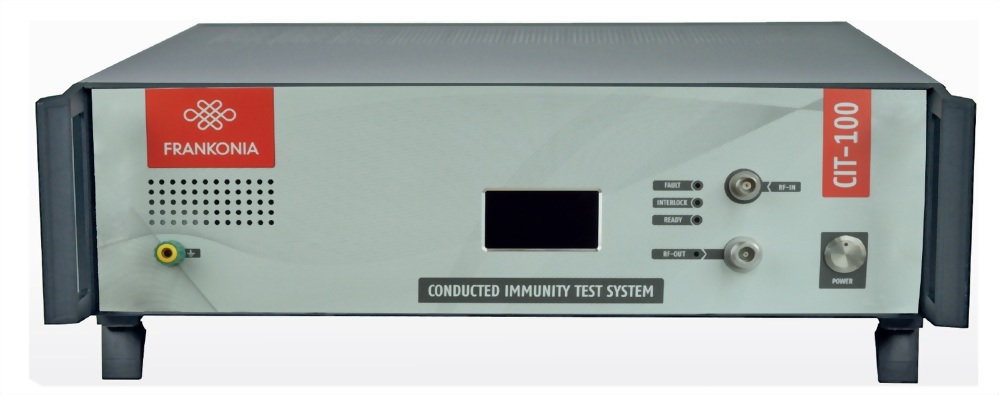 FRANKONIA CIT-100為完整的傳導射頻耐受性測試系統(CS系統),符合IEC/EN 61000-4-6 ED4.0、ISO 11452-4、MILSTD 461E/F CS114、SAE-J1113-2 與類似標準。其內部的射頻產生器與射頻功率放大器,可於頻率範圍 10 或100kHz∼400MHz 內產生最大150W 的輸出信號。所產生的信號可透過內部射頻電壓計測量而得;此外過選購的方向耦合器測量順向與逆向功率。