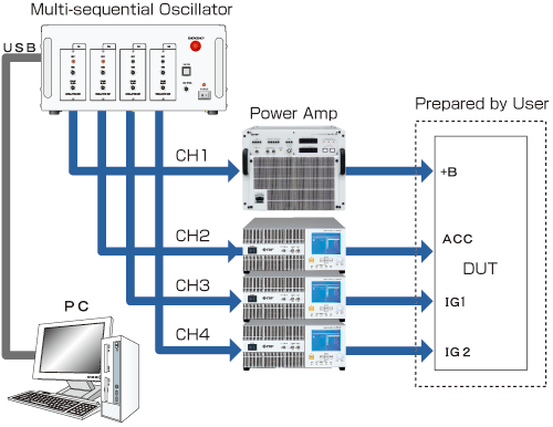 The SG-7040 Series simulates power supply voltage fluctuation to test automotive electronics. Connections of automotive electronics are not limited to +B, but connections are also done to ACC and IG.